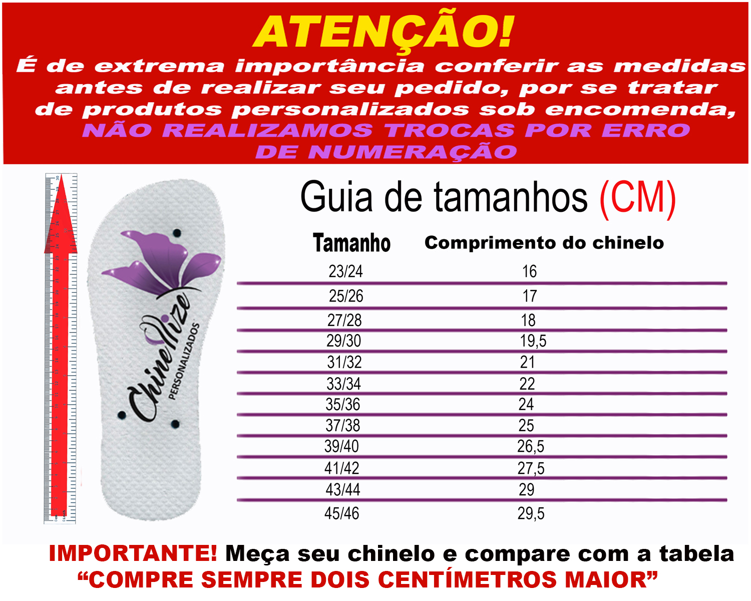 Para garantir sua satisfação e evitar transtornos, é de extrema importância conferir as medidas que estão abaixo antes de realizar seu pedido.